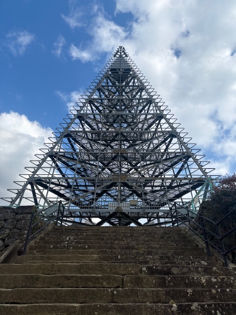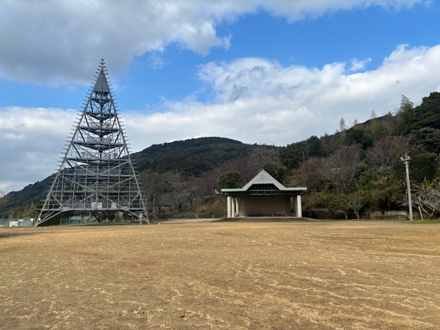 なお、江迎小学校は別の場所に移転され、現在は大きな広場になっています。8月に開催される祭りの会場になっているようで、この大きな塔は、その際に灯篭を飾るためのようです。最初はなんだこりゃ!って思いました。
