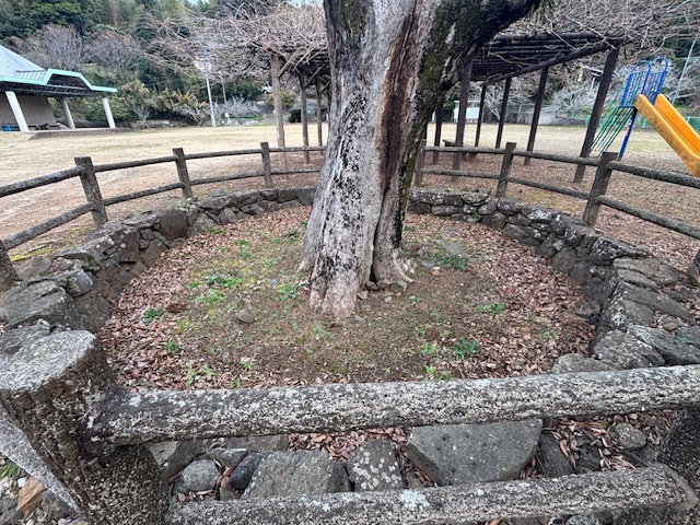 その後、江迎小学校が建てられ、そのグランド整備の際に盛土をしたのですが、ムクノキは当時の位置のまま置かれていたようで、このような状況になっているようです。